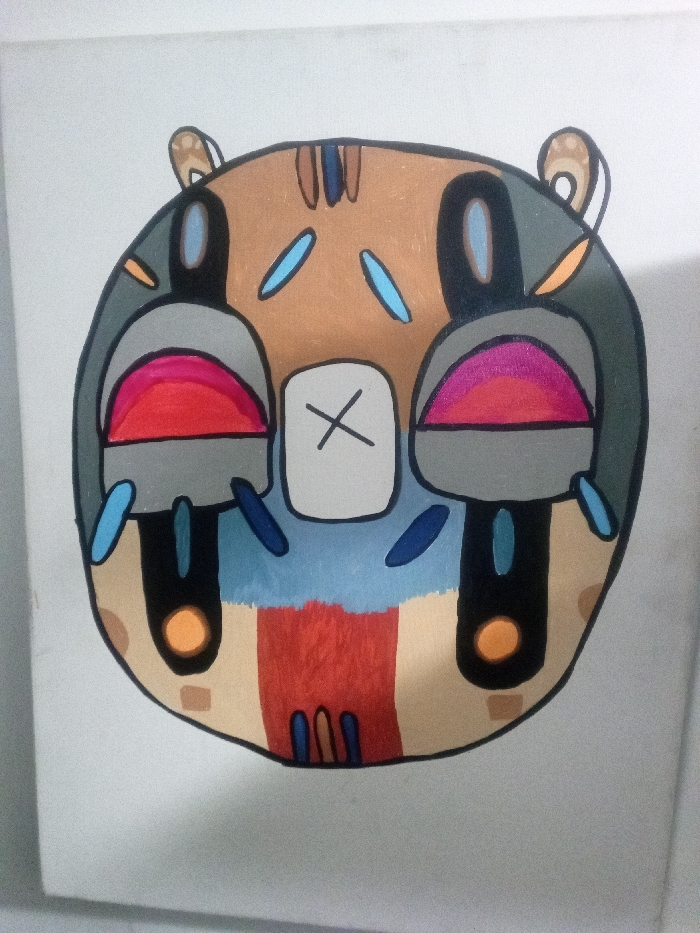 The image displays a vibrantly colored, stylized character's head, drawn or painted on a plain white surface, likely a canvas or wall