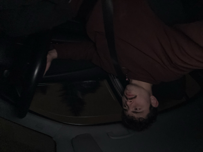A person with dark hair and a mustache is inside a car, seemingly in the driver's seat, wearing a red-brown long-sleeved shirt and a seatbelt. The perspective is from an unusual angle, almost upside down, capturing the steering wheel and a partial view of the dashboard and front window with an indistinct reflection. The overall lighting is low, casting shadows within the car's interior.