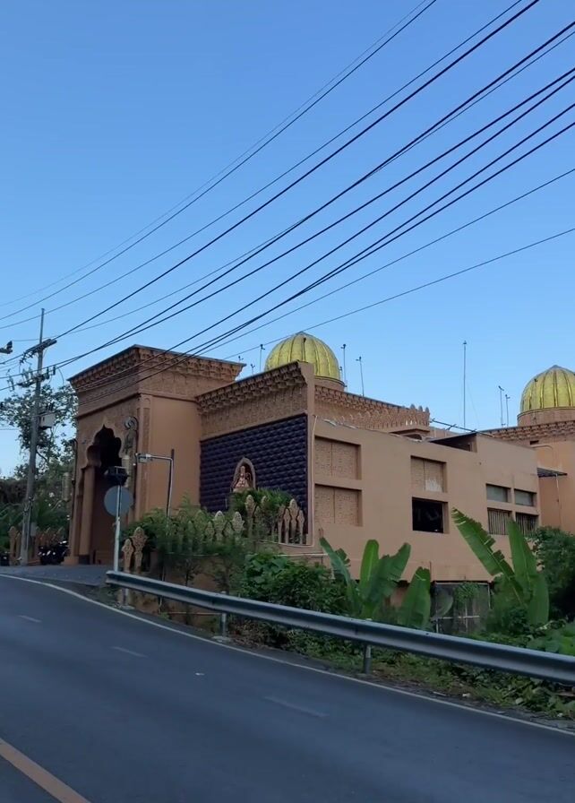 building with elaborate architectural details. The building is mostly tan with some dark blue textured accents and features gold-colored domes on the roof. There is a large, ornate gateway leading into the property. The building is situated on a hillside surrounded by greenery, including banana trees and hedges. A black asphalt road runs in front of the building, with a yellow line marking the center. Power lines and utility poles are visible along the roadside, slightly obscuring the view of the building and sky. Several motorcycles are parked near the gateway. The sky is clear and blue.