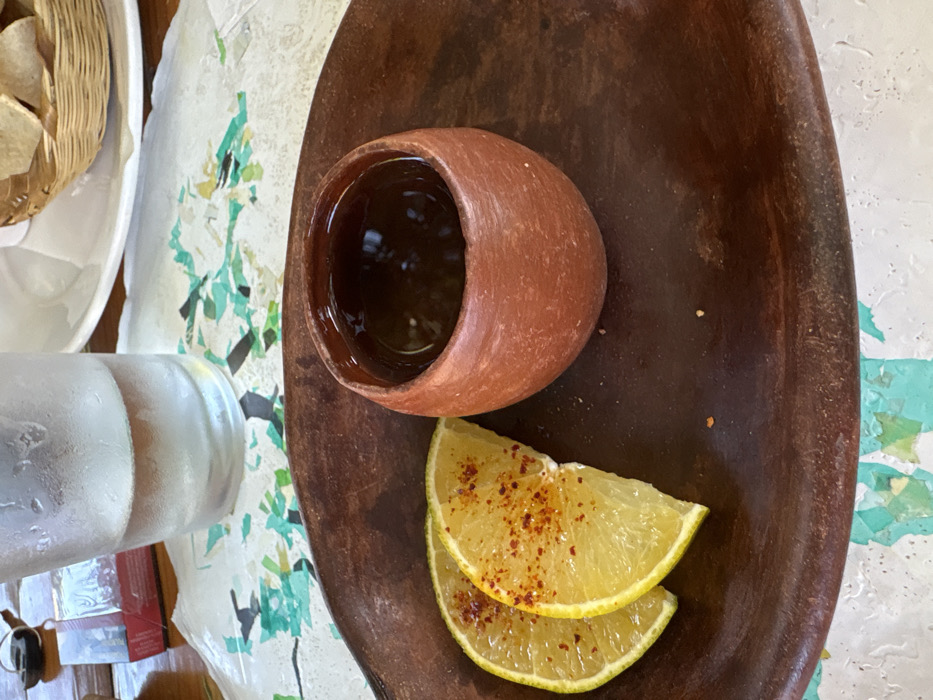 A top-down view shows a table setting. A brown, oblong wooden plate holds a small, rounded terra cotta bowl filled with a dark liquid. Beside the bowl are two lemon wedges sprinkled with reddish-brown seasoning. To the left, a partial view of a glass filled with water and a basket of tortilla chips are visible. The table surface features a patterned design with white, blue, and green hues.
