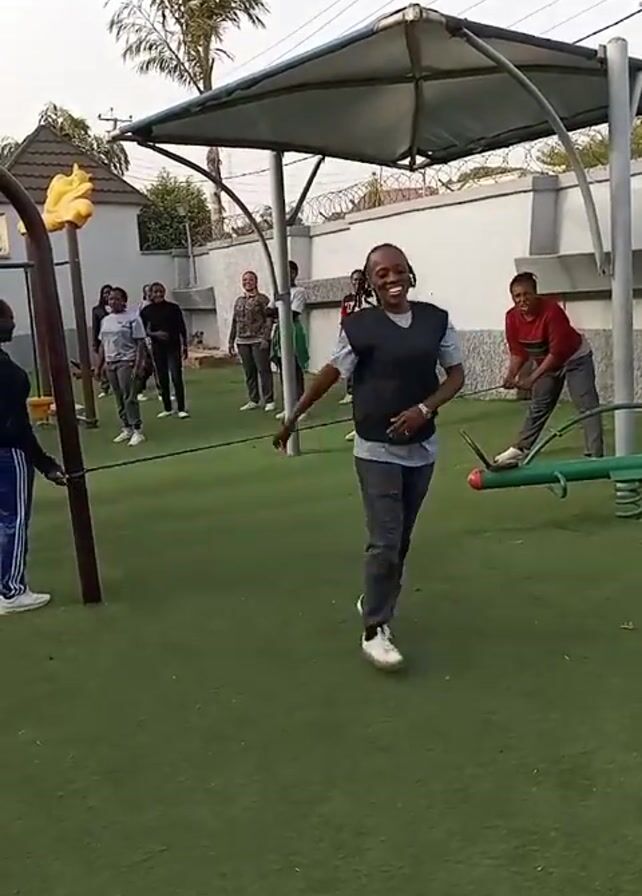 A group of people are gathered in an outdoor playground area with green artificial turf. There is a covered structure supported by metal poles, and playground equipment like a seesaw and a bar structure with yellow decorative tops. Some individuals are standing and watching, while others are actively participating in some kind of rope course activity. People are walking and jogging around the playground. Two people are seen attempting to jump or step over a rope strung between poles, displaying enthusiastic body language. One of the participants is wearing red pants and white sneakers, while the other is in dark athletic pants and white sneakers. The atmosphere appears to be light and fun.