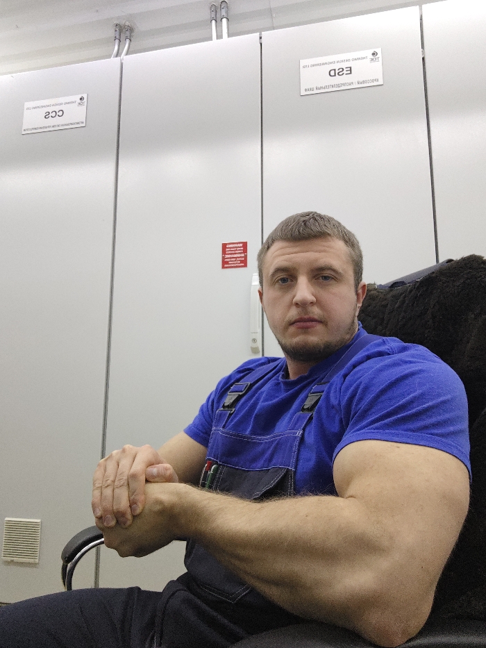 A male individual is seated in a black office chair indoors, facing the camera directly, in an unspecified location within the city of Unknown, Unknown. He has a muscular build, short light-brown hair, and a neutral expression. He is dressed in a royal blue short-sleeved t-shirt and dark blue work overalls with black straps; a chest pocket on the overalls contains three pens (red, green, black). His hands are clasped together in front of him. The chair's backrest is covered with a dark, possibly fur-like, material. Behind the subject are light gray industrial-style panels or cabinets. These panels feature several inverted labels, including "CCS" and "ESD," and text in Cyrillic script, such as "ТЭК ОМК ИНЖИНИРИНГ ЛТД" and "ОПЕРАЦИОННО-ТЕХНИЧЕСКОЕ УПРАВЛЕНИЕ". A red warning sticker with Cyrillic text is also affixed to a panel. A white ventilation grille is visible on a lower panel to the left of the subject. White ceiling panels with exposed metallic conduits are visible at the top of the frame.