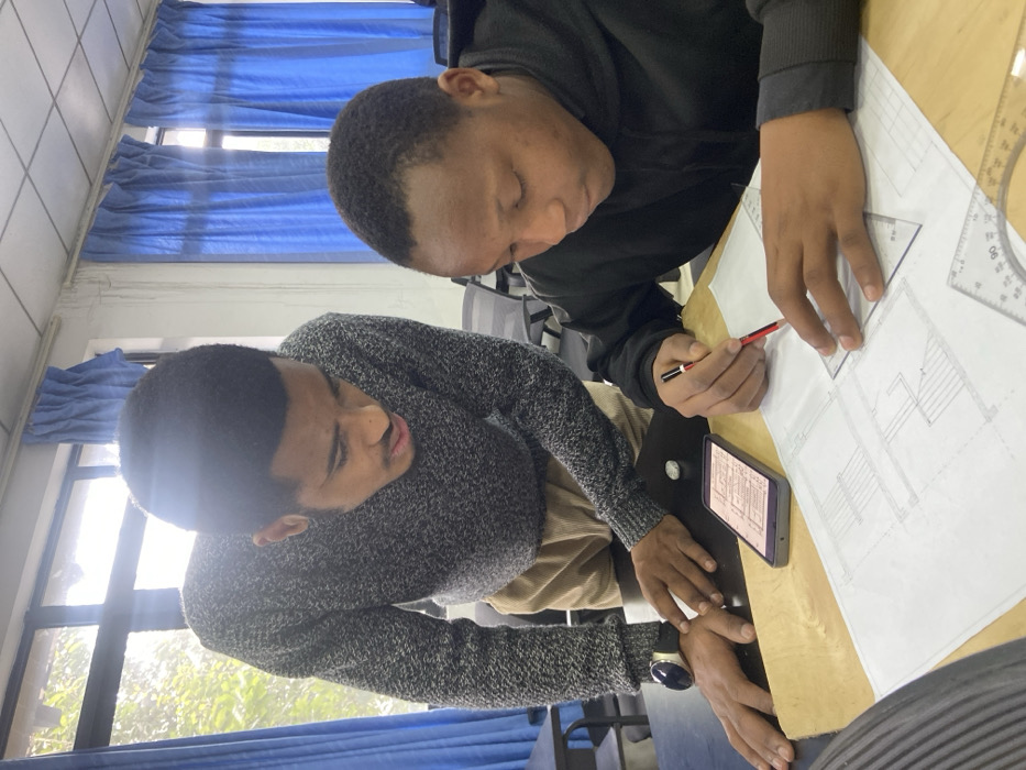 Two young men collaborate on architectural drawings at a table. One man in a grey sweater leans in close, while the other, in a black jacket, uses a pencil and triangle to draw on a large sheet of paper. The blueprint for a building is displayed on a phone beside them. Measuring tools are scattered on the table. Blue curtains hang in the background near a window.