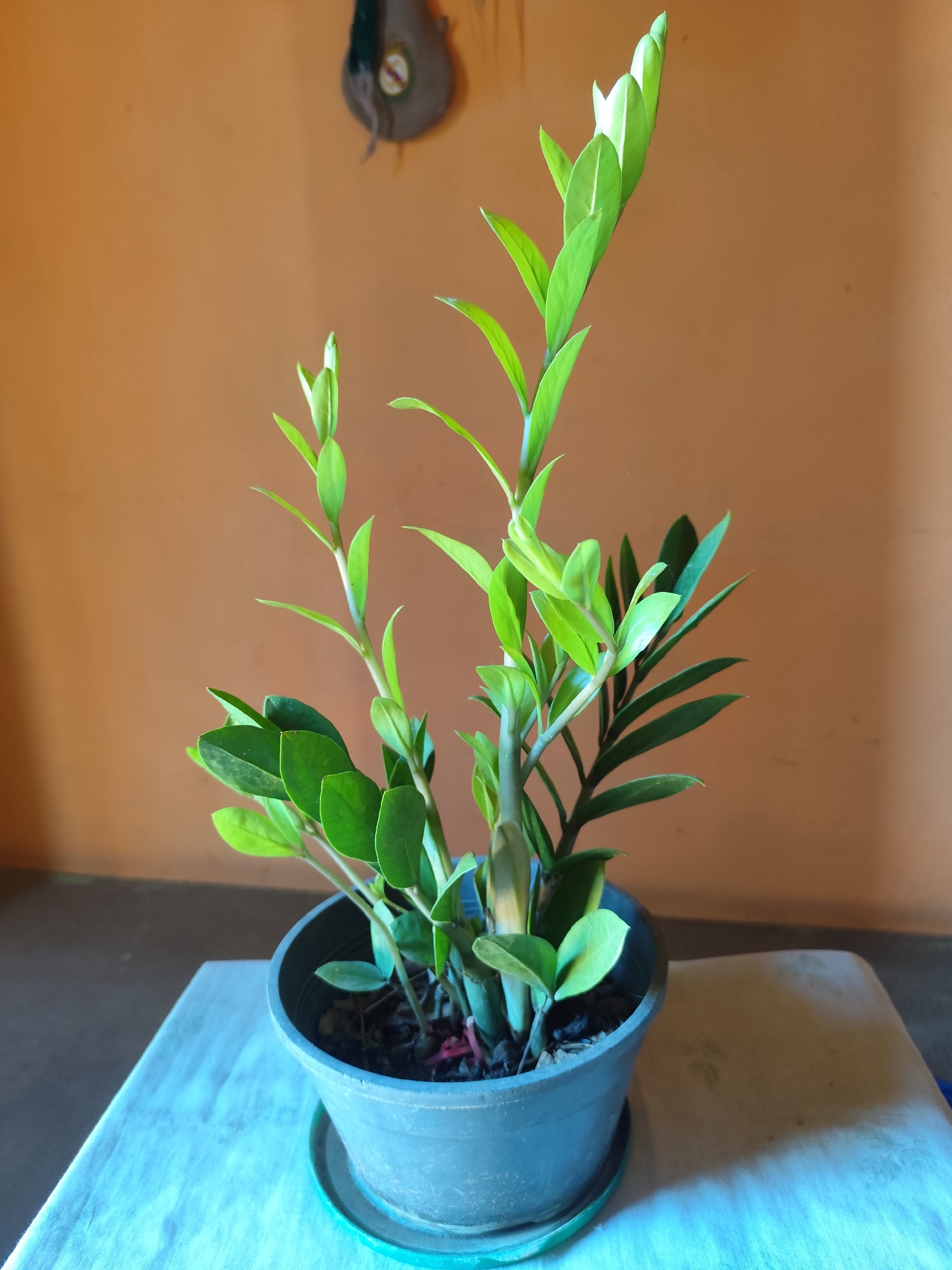 - "The image presents a Zamioculcas zamiifolia (ZZ Plant) in a dark gray plastic pot, resting on a dark green plastic saucer" by FM-XHI3Q2, licensed under CC BY 4.0