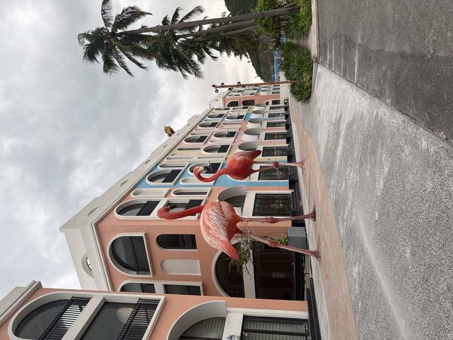 The image depicts an outdoor urban scene in Nha Trang, Vietnam, featuring a long, multi-story building with a pastel-colored facade. The building, displaying a Mediterranean architectural influence, has numerous arched windows and balconies with black railings. The left section is predominantly salmon-pink, transitioning to light blue, cream, and other pastel shades further to the right. Most ground-level units have darkened glass doors, indicating they are either vacant or under construction. In the foreground, two oversized, salmon-pink flamingo statues stand on a light gray, textured paved walkway. A larger flamingo is positioned on the left, slightly forward, while a smaller one stands to its right and slightly behind. To the right of the paved area, a dark asphalt road is visible. Further right, a strip of green foliage and several tall palm trees are present, with a lush green hillside in the far background. A yellow construction crane boom is discernible above the building's roofline in the middle distance. The sky is overcast and uniformly gray. No individuals are present in the scene.