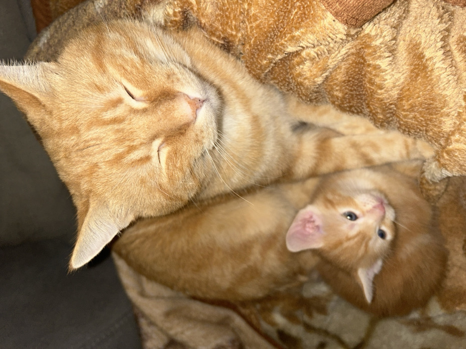 - "A close-up, eye-level photograph depicts two ginger tabby cats, an adult and a kitten, resting together on a patterned blanket in Strasbourg, France" by FM-ZvYlO2, licensed under CC BY 4.0
