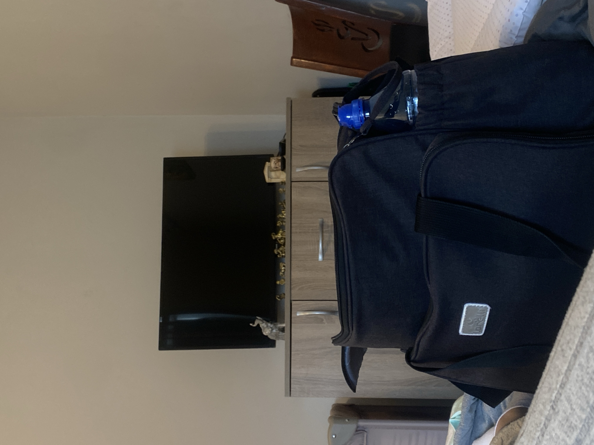 The image depicts an interior scene. A black duffel bag, with a water bottle sticking out of its top, is positioned on top of a light-colored cabinet with silver handles. To the left of the cabinet, a television is mounted on the wall. On the cabinet there is a small elephant figurine. A wooden chair is visible partially in the background. The location of this image is not able to be determined from the image.