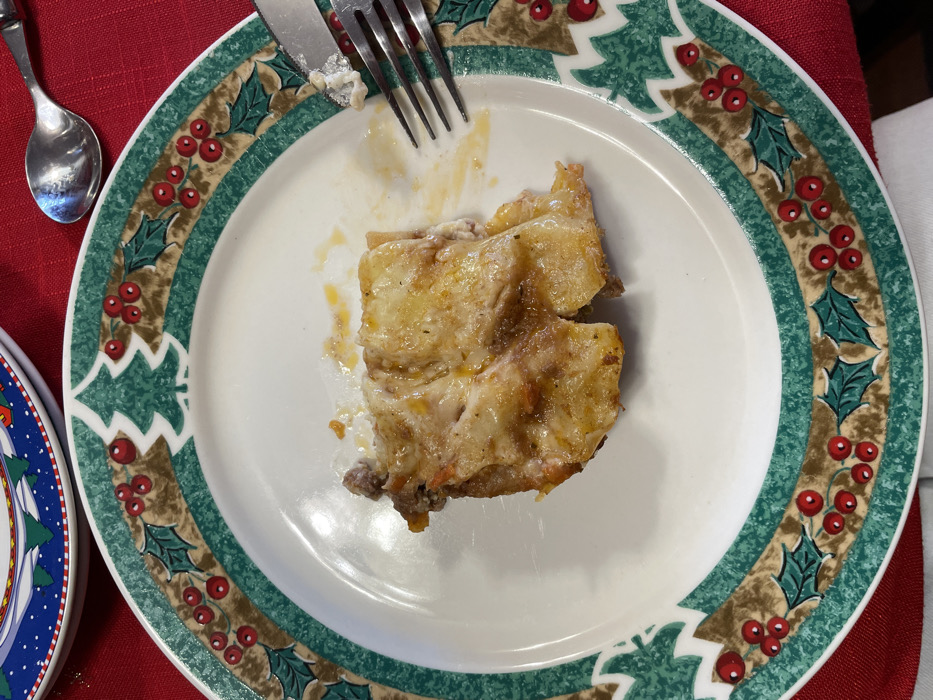 - "A partially eaten piece of lasagna sits on a Christmas-themed plate with a green rim, holly leaf design, and red berries" by FM-nvaX33, licensed under CC BY 4.0