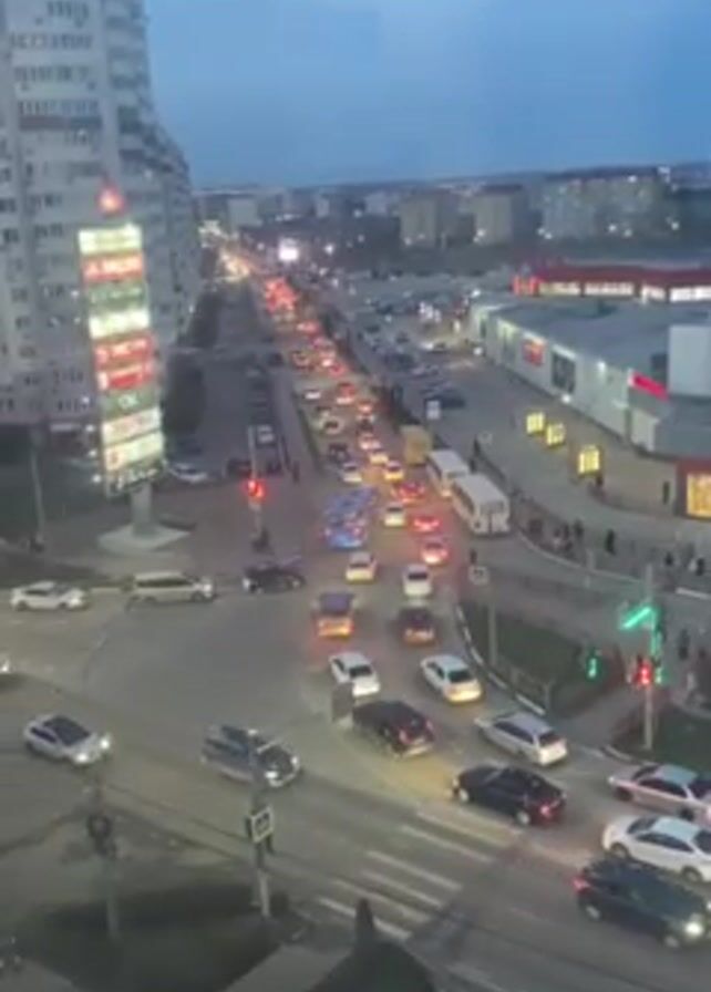 city street intersection with heavy traffic at dusk. Numerous cars, including sedans, SUVs, and buses, are visible, mostly stopped at red traffic lights. Pedestrians can be seen on the sidewalks and crossing the street at crosswalks. The background features tall apartment buildings, a shopping center with visible store signs, and a parking lot. The overall scene depicts a busy urban environment during the transition from daylight to evening.