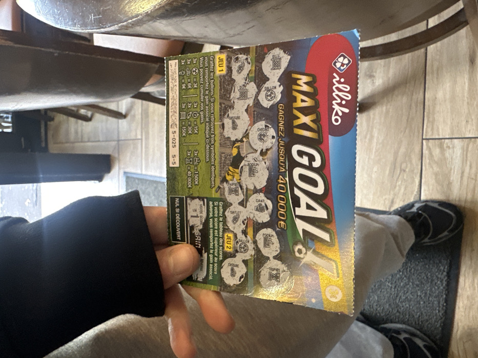 A person's left hand, wearing a black long-sleeved garment, holds a partially scratched "Illiko MAXI GOAL" scratch-off lottery ticket