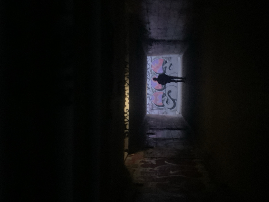 - "A single individual, male, is observed from behind, walking deeper into a dimly lit concrete underpass or tunnel in the city of Kyiv, Ukraine" by FM-BI1Cp2, licensed under CC BY 4.0
