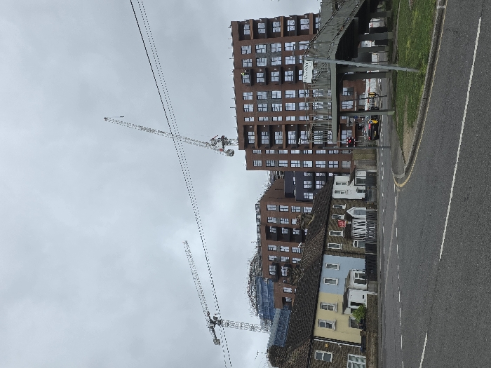 The image depicts an urban street scene in Harrow, London, United Kingdom, under an overcast sky. In the foreground, an asphalt road with white dashed and solid markings curves, indicating an intersection. To the left, a row of three distinct two-story terraced houses stands; from left to right, their facades are beige brick, yellow, and light blue, with white window frames and front doors. A small red sign is visible on the middle house. In the midground to the right, a metal pedestrian bridge with railings crosses above the road. A sign on the bridge railing reads "HARROW AY." Beneath the bridge, a red traffic light is illuminated. A dark-colored vehicle, possibly a taxi or private hire car with a yellow rear bumper or livery, is stopped at the red light. The background is dominated by large, multi-story modern residential buildings with dark brown brick facades and numerous rectangular windows. These buildings are under active construction, evidenced by two prominent white tower cranes visible against the sky, one positioned behind the central buildings and another to the right, atop a completed section. Construction workers in yellow vests are faintly discernible on some balconies of the new buildings. Further to the left in the background, another large structure under construction is partially visible, covered with blue netting or scaffolding. A small patch of grass is present on the right edge of the foreground.