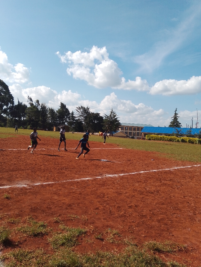 group of five young men playing soccer on a dirt field. The field is surrounded by green grass and a few trees. There is a building in the background. The sky is blue with white clouds. The coordinates (-1.249, 36.691) place this location in Rungiri, Kenya. The men are wearing shorts and jerseys, some are barefoot, and some are wearing shoes. They are playing on a red dirt field that has white lines marking the boundaries of the soccer field. Two players are standing still and looking at the ball, while the others are running towards the ball. The image appears to have been taken during the day, the sun is shining brightly, casting shadows of the players on the ground. The environment is rural with a few buildings in the background.