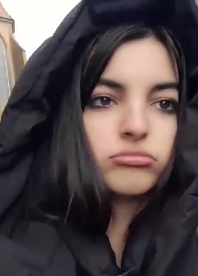 A young woman wearing a black puffer jacket with the hood up is the main subject of the video