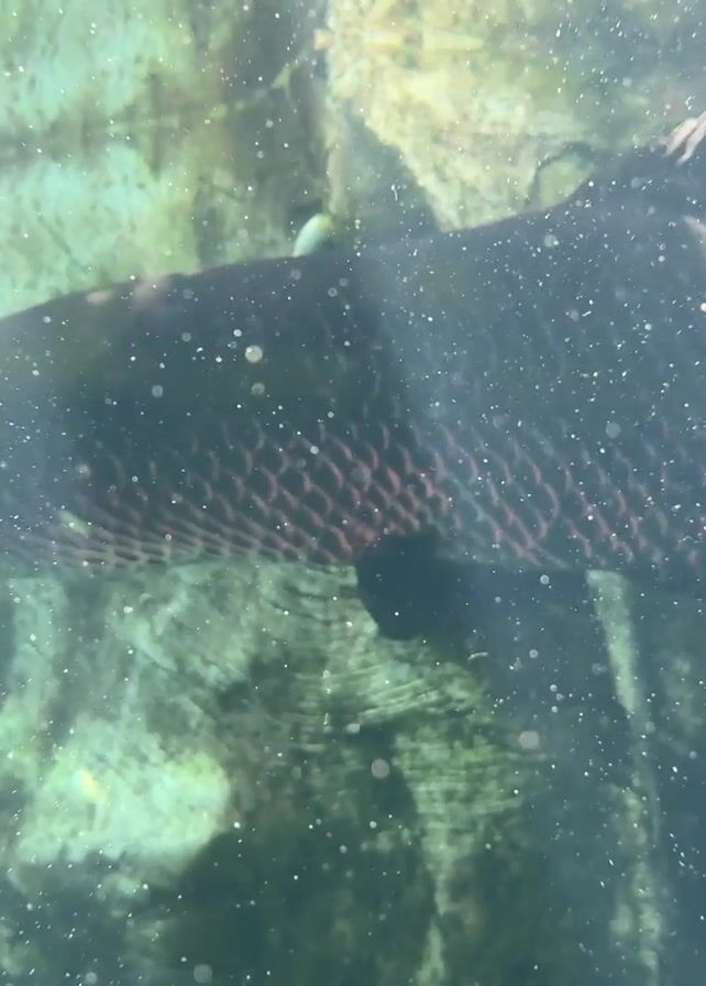 large, dark fish swimming in an aquarium. The fish has a thick body with a pattern of red markings on its scales. The water is slightly murky with particles floating in it. Behind the fish, there's a rock formation covered in algae.