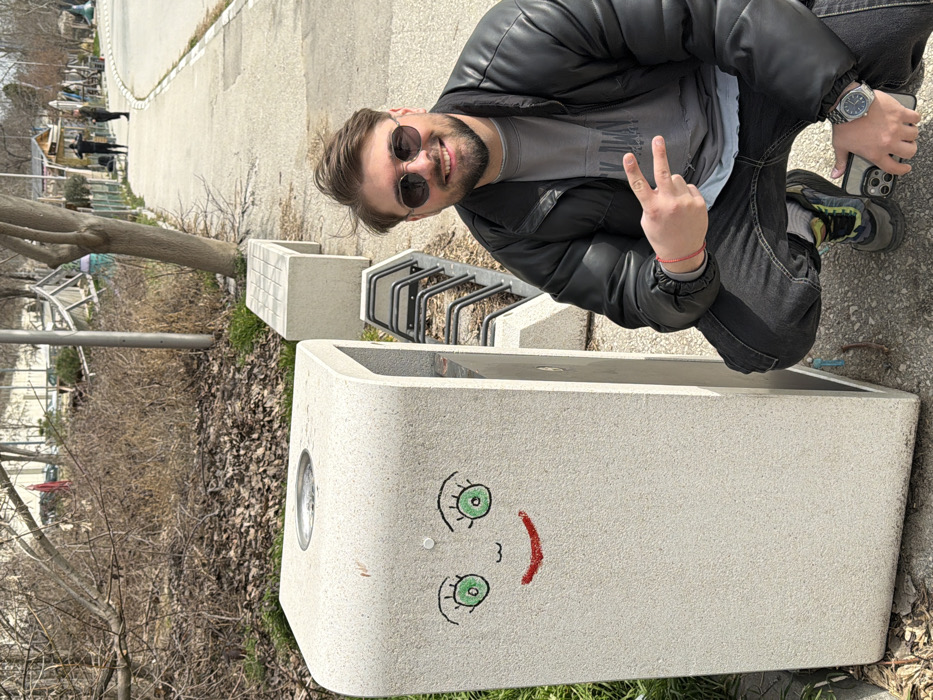 The image depicts an outdoor scene in the Sea Garden (Morska Gradina) of Varna, Bulgaria, under clear daylight conditions. In the foreground, a light-colored, rectangular concrete trash receptacle stands prominently on the left. A stylized face has been drawn on its front using markers: two green circles with black outlines and lashes for eyes, a small black dot representing a nose, and a red upward-curved line for a mouth. To the right of the trash bin, a male individual is crouched, facing the camera. He appears to be in his late 20s or early 30s, with brown hair, a beard, and dark sunglasses. He is wearing a black padded jacket, a grey t-shirt, dark jeans, and multi-colored sneakers. A silver watch is visible on his left wrist, and a red string bracelet is on his right. The man is smiling and extending his right hand, displaying a 'peace' sign (V-sign) with his index and middle fingers. His left hand is partially visible, holding a smartphone with multiple camera lenses. Behind the man and the trash bin, a grey metal bicycle rack is partially visible, alongside a light-colored concrete bench with a textured top. A paved pathway, likely asphalt or concrete, extends diagonally from the midground into the background on the right side of the frame. The left side of the scene is dominated by bare trees and dry, brown foliage, indicative of a dormant season. In the distant background along the pathway, several indistinct human figures are visible. Further beyond, obscured by trees, are various structures and buildings under a bright sky.