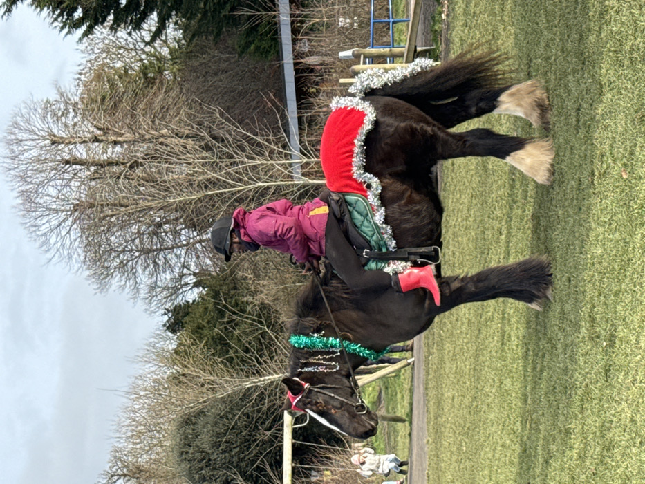 An individual is depicted riding a dark brown or black horse in a grassy field in Stanmer, United Kingdom, under a partially cloudy sky. The rider, positioned in profile facing left, wears a black riding helmet, a fuchsia jacket, dark trousers, and bright red boots. The horse is adorned with festive decorations: red ear bonnets, green tinsel around its neck, a red blanket over its back covering a green quilted saddle pad, and silver tinsel along its back and tail. The horse exhibits feathering on its lower legs, which are light tan on the hind legs. In the background, deciduous trees, mostly bare, and some evergreen trees are visible. To the far left, a wooden swing set is present with two small children in the distance. Further to the right, a low-slung building with a dark roofline is discernible.