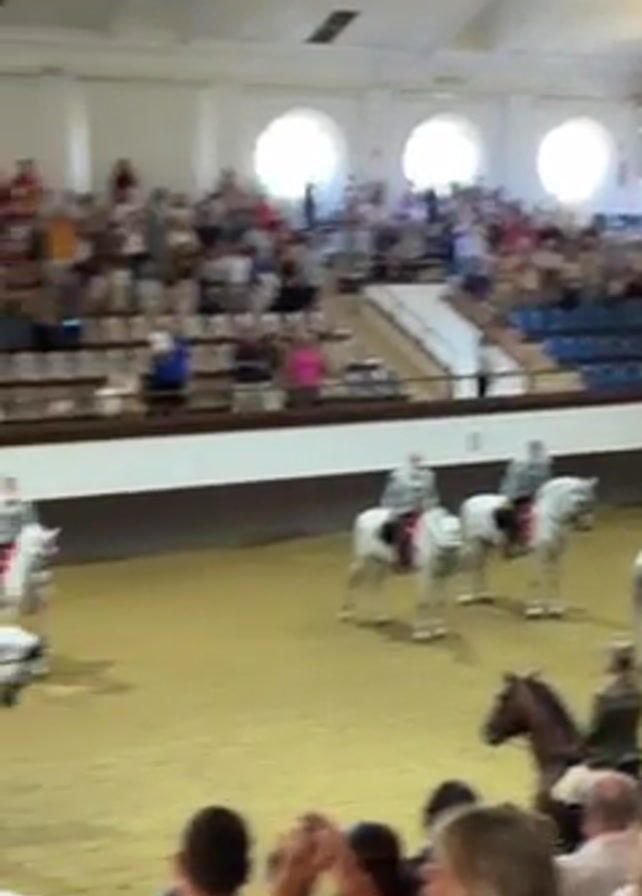 performance inside a large arena, likely in Spain, judging by the flags displayed. Many people fill the stands around a central, sandy-colored ring. Several riders on horses, predominantly white, perform for the crowd. Some riders are in black uniforms, while others wear white jackets. The arena is well-lit, and the crowd appears to be enjoying the spectacle.