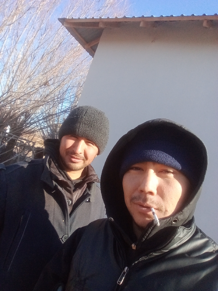 Two adult males are depicted outdoors in Chimbay, Uzbekistan