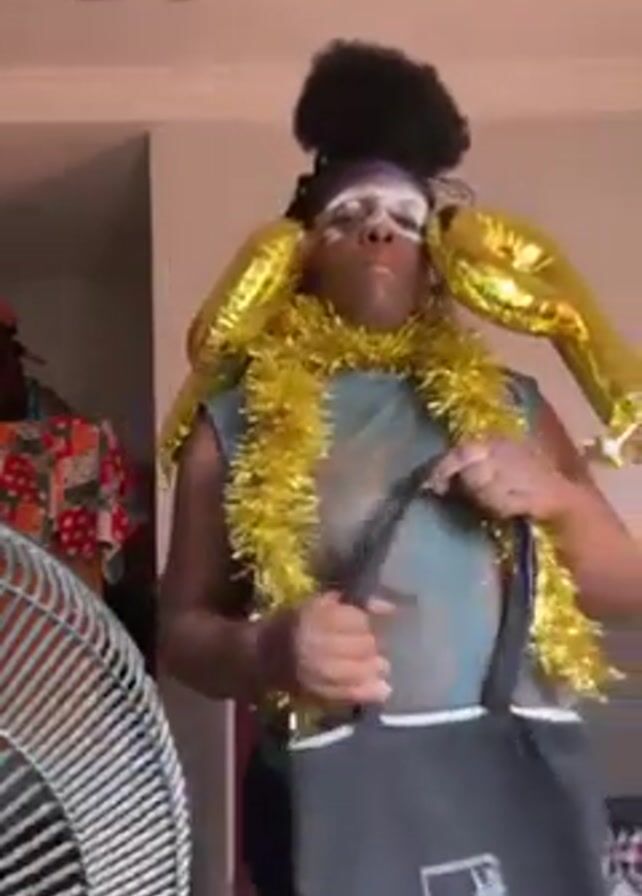 A person is standing in a room, decorated with gold balloons and tinsel around their neck. They have an afro hairstyle and white face paint. They are wearing a grey sleeveless shirt and black shorts. The person is holding a black tote bag with white writing on it. In the background, there is a fan, a door, and a patterned quilt. The room appears to be casually decorated and homey.