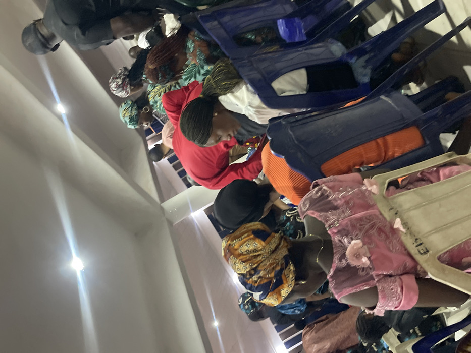 The image depicts an indoor gathering of multiple individuals, primarily women, seated in rows within a large room in Kufena, Nigeria
