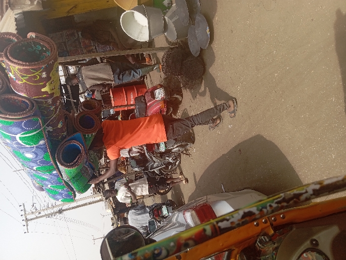 An outdoor market scene in Fagge D2, Nigeria, is depicted under bright daylight with a dusty, unpaved ground
