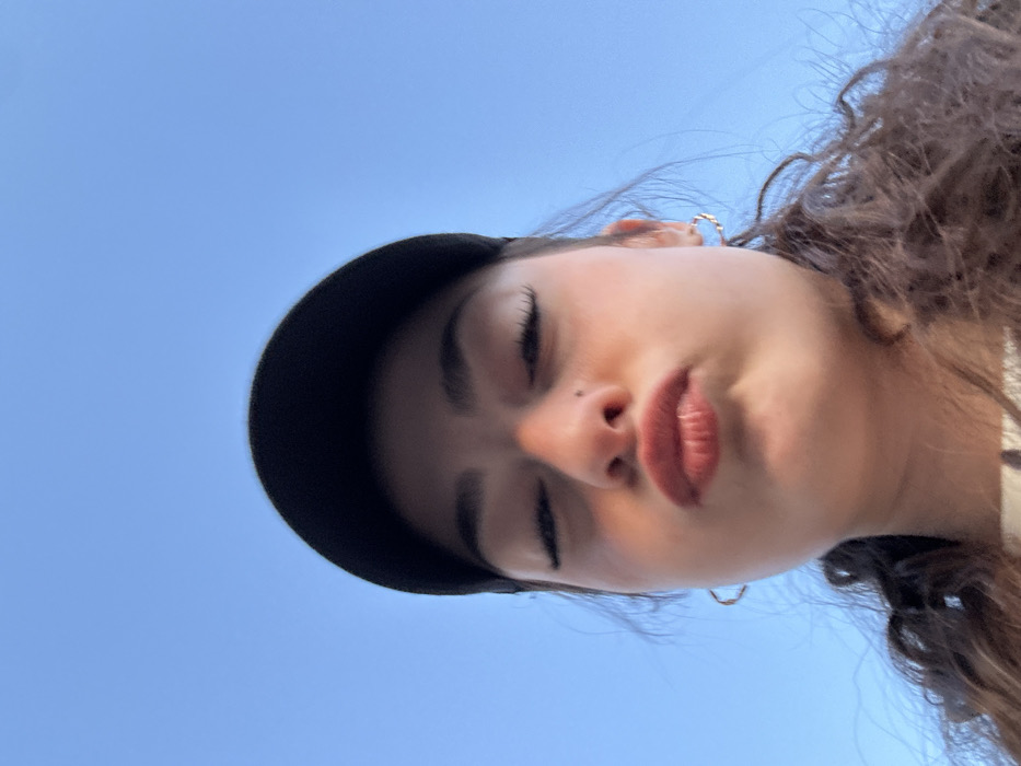 A young woman with curly brown hair wears a black baseball cap against a bright blue sky. She is looking down at the camera, her eyes closed in a relaxed or playful expression. Her lips are slightly pursed. She has delicate silver hoop earrings and appears to be outdoors, possibly tilting her head back to capture the shot.