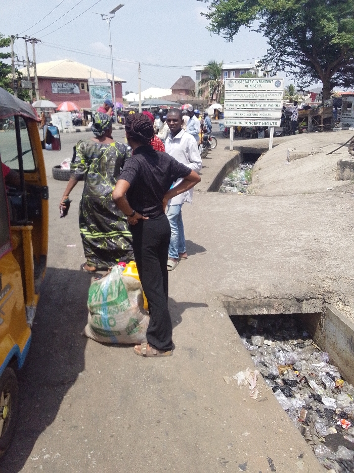 A street scene shows people gathered near a yellow auto rickshaw. One woman stands with a large sack labeled "AJAYA ANO." Nearby, a concrete drainage ditch is filled with litter. A sign reads, "KOGI STATE GOVERNMENT OF NIGERIA," followed by "KOGI STATE MINISTRY OF WORKS," and "UMSUKBIR CONCEPT NIG LTD." The sign indicates construction or engineering-related work. The overall scene suggests a bustling area with possible environmental concerns regarding waste management.