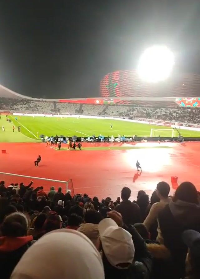 view from the stands at a soccer stadium, likely before a match, as players warm up on the green field. The stands are full of spectators, and the overall lighting is bright despite the dark sky. A running track separates the stands from the field, where several individuals are seen sitting on chairs or standing along the edges. The stadium architecture is modern with a distinctive red and green pattern on the exterior.