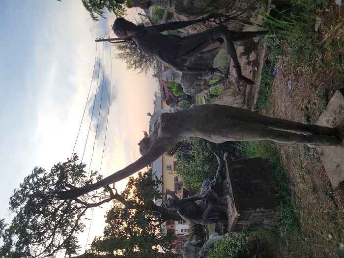 Several cement sculptures are presented in an outdoor setting. One sculpture features a human form, with its arms reaching upwards. Another depicts a figure appearing to be holding a tool. The sculptures are positioned among trees, plants, and grass. In the background, there is a building. The sky is visible above the sculptures.