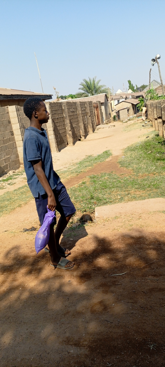 The image captures a daytime scene in Ungwan Liman, Nigeria. A male individual, appearing to be a youth, stands in profile on an unpaved reddish-brown dirt path, facing right. He wears a dark blue short-sleeved polo shirt, dark blue shorts, and dark slip-on sandals. His left hand holds a translucent purple plastic bag containing indeterminate contents. The background features several single-story structures constructed from concrete blocks or mud bricks, many with corrugated metal roofs, lining a similar dirt pathway. Patches of green grass and sparse vegetation are present. A prominent palm tree is visible in the mid-background. To the left, a tall, slender pole extends upwards. On the right, a wooden pole supports two conical loudspeakers. The sky above is clear and light blue, indicating daylight. Dappled shadows are cast on the foreground path.