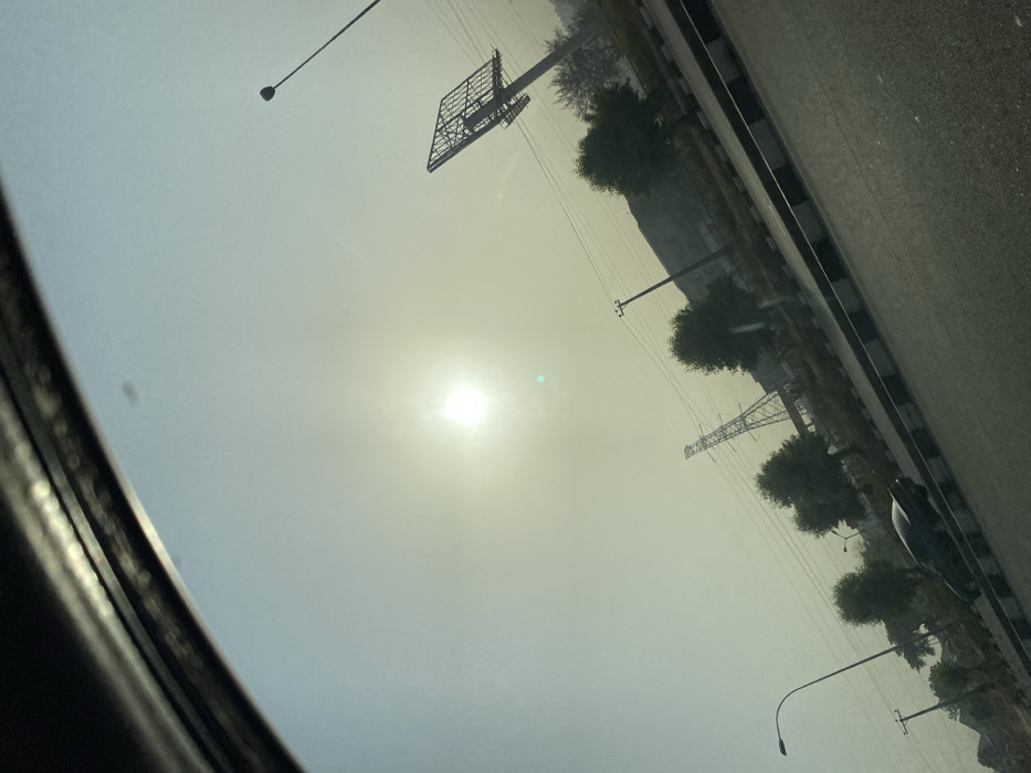 A hazy, bright sky obscures details, with the sun appearing as a radiant square. Trees line a road that runs alongside power lines and tall electrical towers. A large billboard frame is visible against the sky. The view is likely taken from within a vehicle, as a portion of the car's interior is visible on the left. The scene suggests a hot, overcast day along a highway.