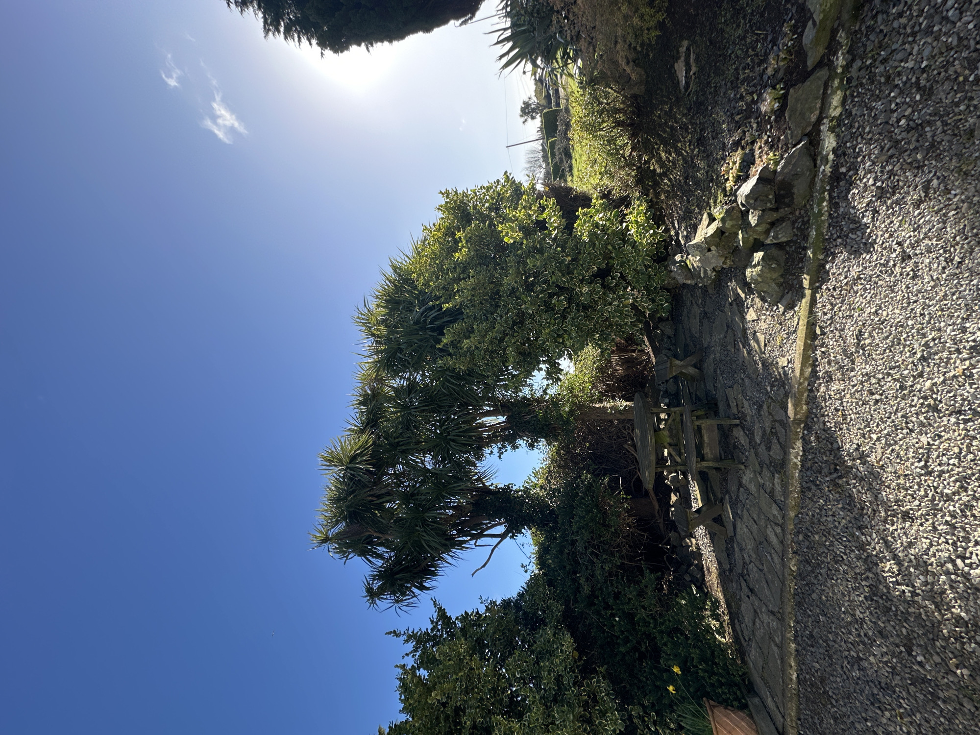 The image displays an outdoor garden area located in Kilrane, Ireland, under a clear, bright blue sky. Sunlight emanates from the upper right, illuminating portions of the scene and casting defined shadows. A small, faint white cloud is visible near the sun, and a minute, distant aircraft appears in the upper left sky. The foreground consists of a light-colored gravel path or driveway, which transitions into an irregular dark grey flagstone patio. A low border constructed from various natural rocks separates the gravel from planted areas. On the far left, a terracotta pot containing green foliage and two yellow daffodils is partially visible. A weathered dark wooden picnic table with attached benches is situated on the flagstone patio, predominantly in shadow. The midground is characterized by dense vegetation. On the left and center, large multi-trunked trees with spiky, palm-like foliage are prominent, with some trunks covered in ivy. To the right, a bushy variegated shrub with green and cream-edged leaves is visible. A tall, slender coniferous tree stands partially visible on the far right edge of the frame, brightly lit by the sun, alongside another spiky, succulent-like plant in a raised bed. In the background, a sunlit grassy slope or field is visible beyond the immediate garden, with scattered trees and utility poles discernible on the distant horizon line. No individuals are present in the depicted scene.