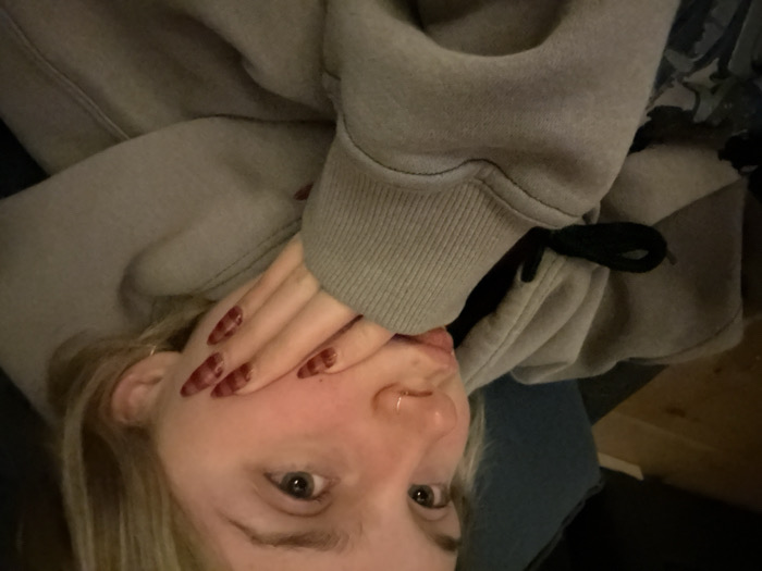 A young woman with blonde hair poses for a selfie, holding a hand up to her face, showcasing long, maroon-colored nails with decorative designs. She wears a light grey hooded sweatshirt with black drawstrings. A silver nose ring is visible. The background is slightly blurred, showing what appears to be a wooden floor and a blue fabric surface.