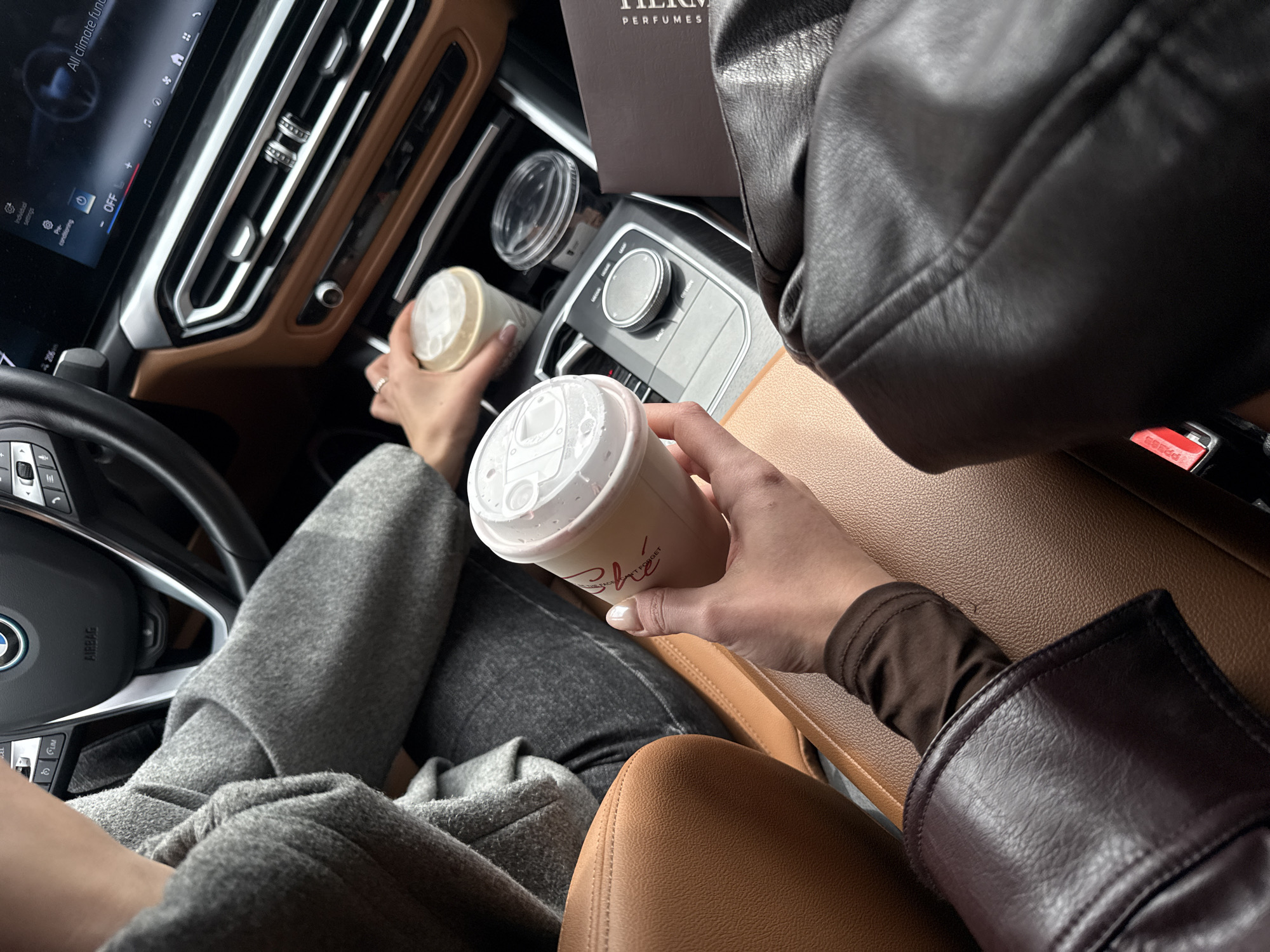 Here is a description of the image: The photo was taken inside a vehicle, specifically a BMW, possibly a luxury SUV based on the interior design and features visible. There are two people in the photo, one in the driver's seat and another in the front passenger seat. The driver is wearing a gray sweater or hoodie and is holding a cup in their left hand, while the passenger is wearing a leather jacket and holding a cup in their right hand. There is a perfume box on the center console, and an empty coffee cup in a cup holder. The center console shows controls for car functions and infotainment system. The interior color scheme of the car is tan. The location is likely in Yerevan, Armenia, suggested by the logo on the coffee cup, "She," which is a well-known cafe chain in the city.
