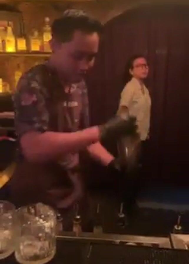 A bartender shakes a cocktail shaker with ice inside. He stands behind a bar with shelves of liquor bottles behind him. He wears a brown apron with the words “LA FAVELA” on it. His shirt has a dark pattern on it. He wears black gloves on his hands. He holds the shaker with both hands and shakes it in front of him and then up and over his shoulder. There are two glasses with ice in them on the bar. There is another person standing behind him to the right side of the video.