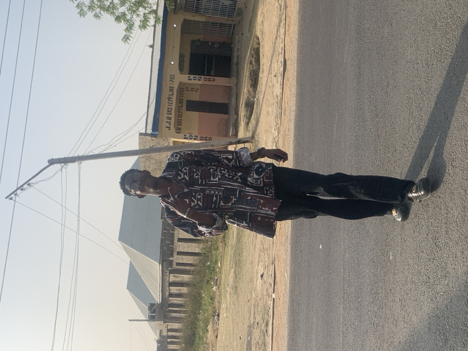 A male individual, estimated to be between 20 and 30 years old, stands on an asphalt road in Dabawa, Nigeria