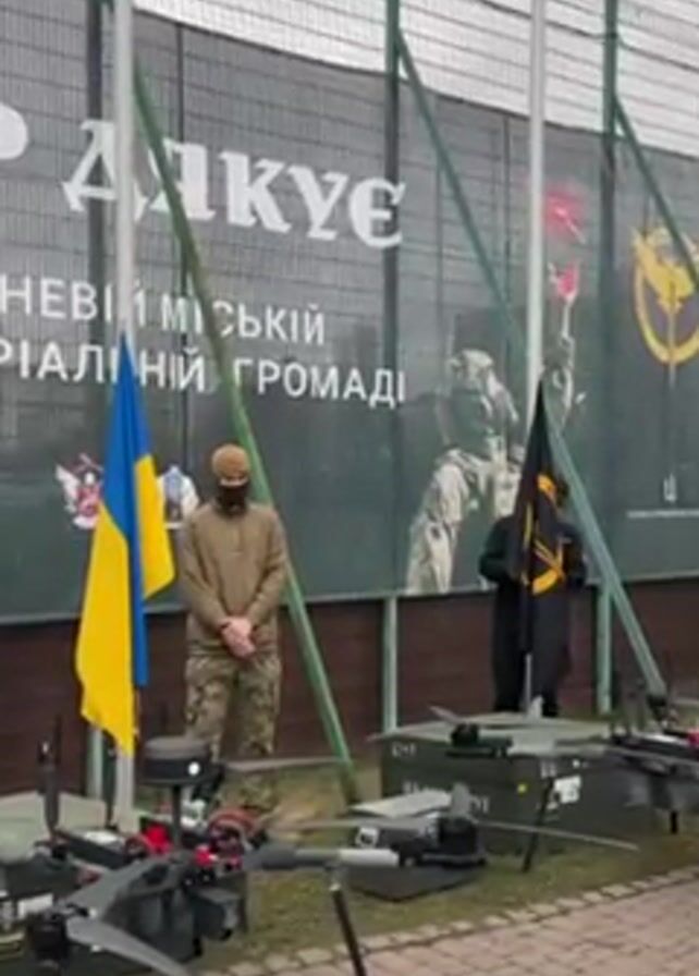 military-themed setting with the Ukrainian flag and a black flag on flagpoles, flanking a banner with Ukrainian text and military imagery. In the foreground are several drones placed on top of green crates. Two individuals are present: one in military camouflage attire with a face covering and another in a dark uniform. The person in camouflage adjusts something on the flagpole. The scene suggests a military event or ceremony, possibly related to the donation or presentation of drone technology. The environment appears to be an outdoor area with a fence in the background.