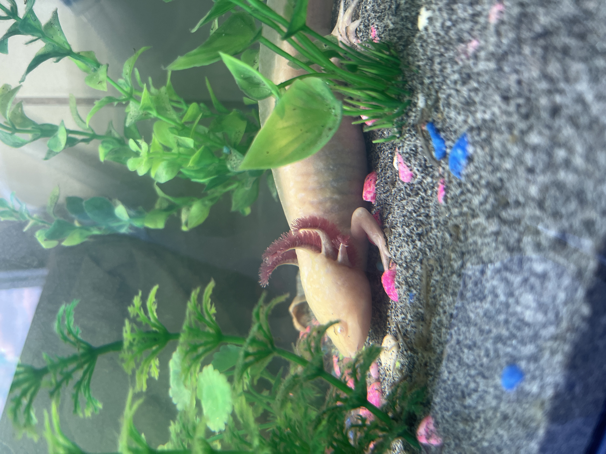 - "An indoor aquarium scene in Pleven, Bulgaria, features a pale, pinkish-white albino axolotl (Ambystoma mexicanum) resting on a dark grey granular substrate" by FM-N2LmI3, licensed under CC BY 4.0