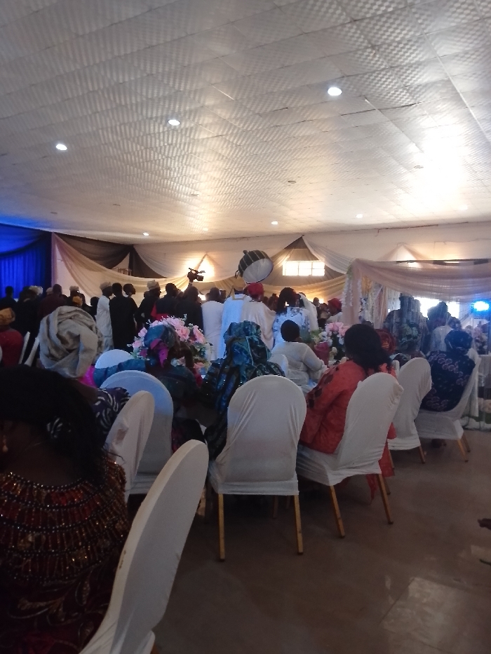 An indoor event is in progress with many attendees. Most people are standing near a decorated backdrop with draped fabrics and flowers. Seated guests are arranged around tables, with their backs to the camera. The chairs are white, and the room has a low ceiling covered with fabric or panels. Lighting fixtures are scattered throughout the space. A camera and lighting equipment are visible in the background. The scene suggests a wedding reception or similar celebratory gathering.