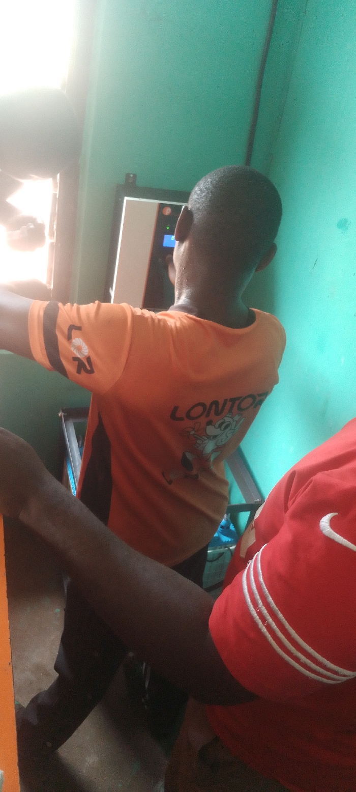 The image depicts an indoor scene within the city of Unknown, Unknown. Two dark-skinned individuals are present. The primary subject, viewed from the back, is a male wearing an orange short-sleeved shirt with "LONTOZ" and a cartoon character logo on the back, and "LQR" with a circular emblem on the left sleeve. He is wearing dark trousers. Sweat is visible on the back of his neck and upper back. This individual is interacting with a light-colored, rectangular electronic device mounted on a teal-green wall. The device has an orange vertical stripe, a blue digital display, and a green indicator light. To the left of this individual, a brightly overexposed window or opening indicates a strong external light source. A second individual's upper right arm and shoulder are partially visible in the lower right foreground, wearing a red short-sleeved shirt with a white Nike logo and three white stripes on the sleeve. The floor is dark.