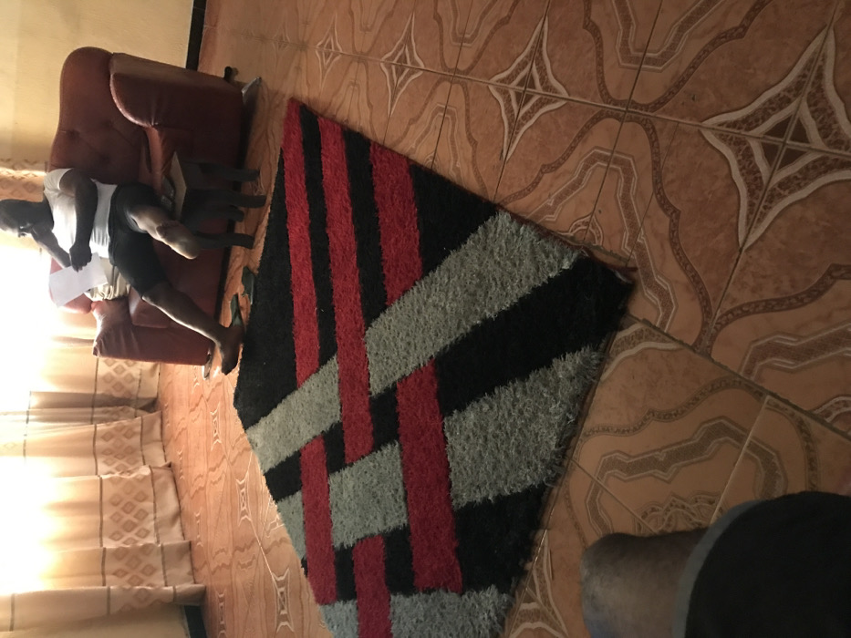 A man sits in a red chair, holding a white document. Next to him is a small wooden table. A multi-colored rug with black, red, and grey stripes lies on a tiled floor with a geometric pattern. Light enters from the side, illuminating a patterned curtain. A dark shape is visible in the bottom right corner.