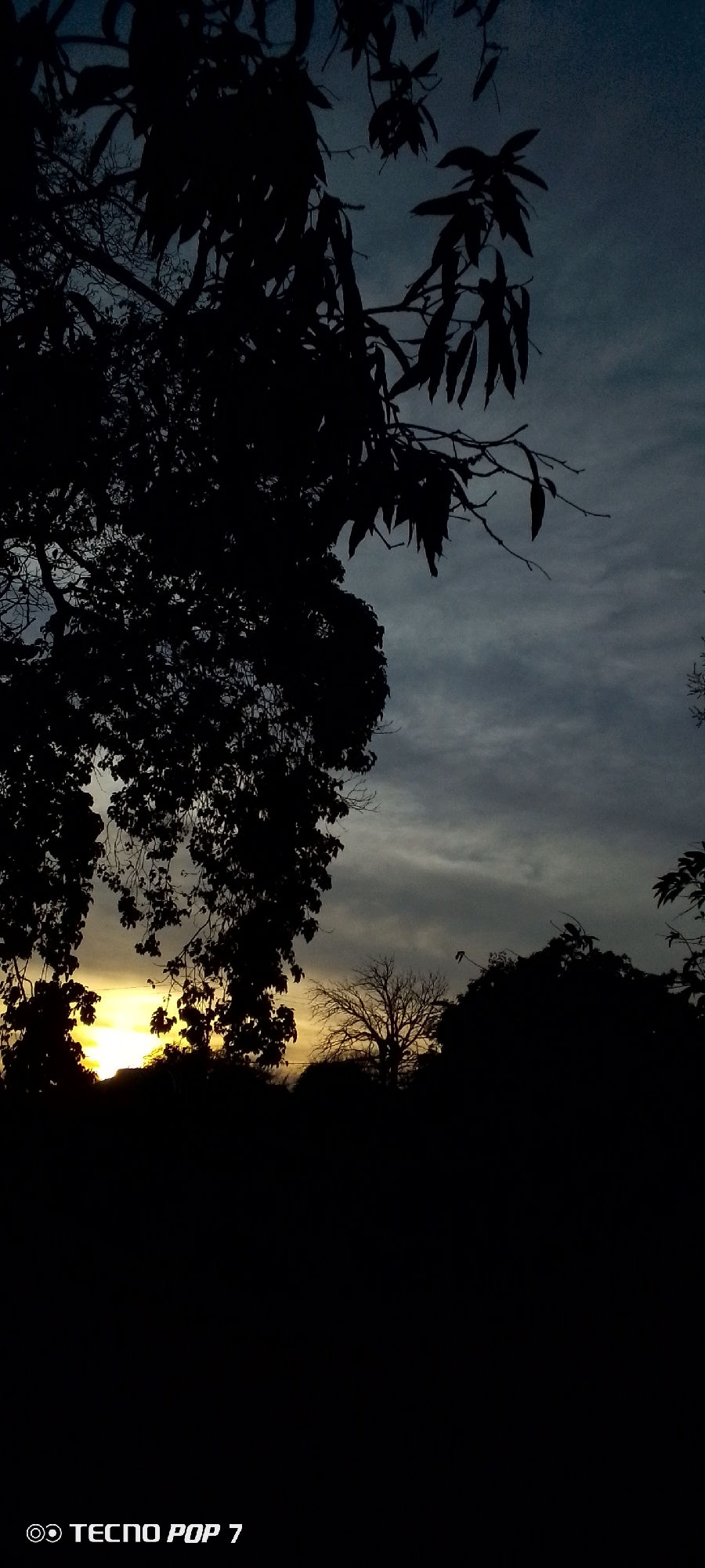 A partially obscured sunset is visible behind a silhouetted landscape with trees, with the foreground being mostly dark. The time of day is either dusk or dawn. No people are visible. The picture was taken with a Techno Pop 7 phone. The location is Altagracia, Venezuela.
