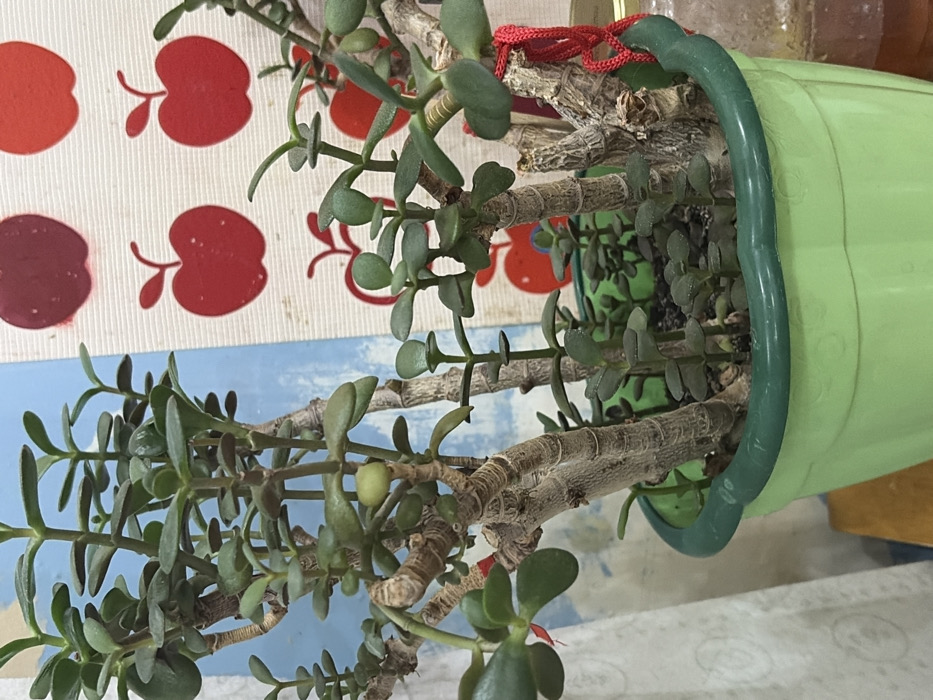 The image displays a close-up, eye-level view of a vibrant Jade plant (Crassula ovata) situated indoors. The plant is contained within a light green, fluted plastic pot with a dark soil substrate visible around the base of its stems. Multiple thick, woody, light brown-grey stems branch upwards, covered in numerous small, oval, fleshy green leaves. Younger shoots with smaller leaves are visible emerging from the soil. A distinct, pale green, almost spherical object, possibly a developing fruit or a gall, is present on one of the central stems. A length of red string or ribbon is tied around a stem on the right side of the plant. The background consists of two main sections. To the left, a vertical panel of light blue, possibly painted wood or a similar surface with subtle texture, is visible. To the right, behind the plant, is a lighter-colored surface, possibly white fabric or wallpaper, adorned with several red apple silhouettes, appearing stenciled or printed. A small portion of a white, textured curtain or fabric is visible on the far left. On the far right, partially obscured by the plant pot, a clear or translucent, yellowish-brown glass or plastic container, possibly a jar, is visible. No individuals, actions, or interactions are depicted. The specific location within the city of Chaikovsky, Russia, cannot be determined from the visual information provided.