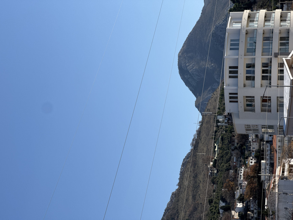 The image displays a clear daytime scene in Sutomore, Montenegro, characterized by a bright blue sky occupying the upper half of the frame. Multiple thin, dark horizontal wires, consistent with utility lines, traverse the sky. A faint circular artifact is visible in the upper central sky, and a subtle diagonal line is present in the upper right quadrant. The background features two prominent mountains with rugged, rocky terrain. The mountain slopes are covered with sparse, dry brown vegetation and scattered trees, many appearing bare, suggesting a dormant or winter state. In the foreground and midground, urban development is evident. A modern, multi-story white building with a curved facade, multiple balconies with glass railings, and numerous windows is prominent in the lower right. To its left, a slender communication tower equipped with multiple antennae is positioned against the hillside. Numerous other residential buildings, mostly white or light-colored, are densely clustered across the lower and middle slopes of the mountains. Additional utility lines are visible crisscrossing among these structures. No individuals or specific actions are discernible within the scene.