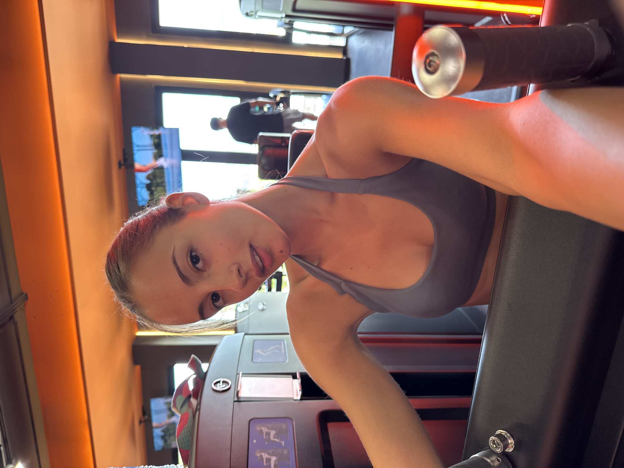 young woman in a gray sports bra using a piece of gym equipment, possibly in a fitness center