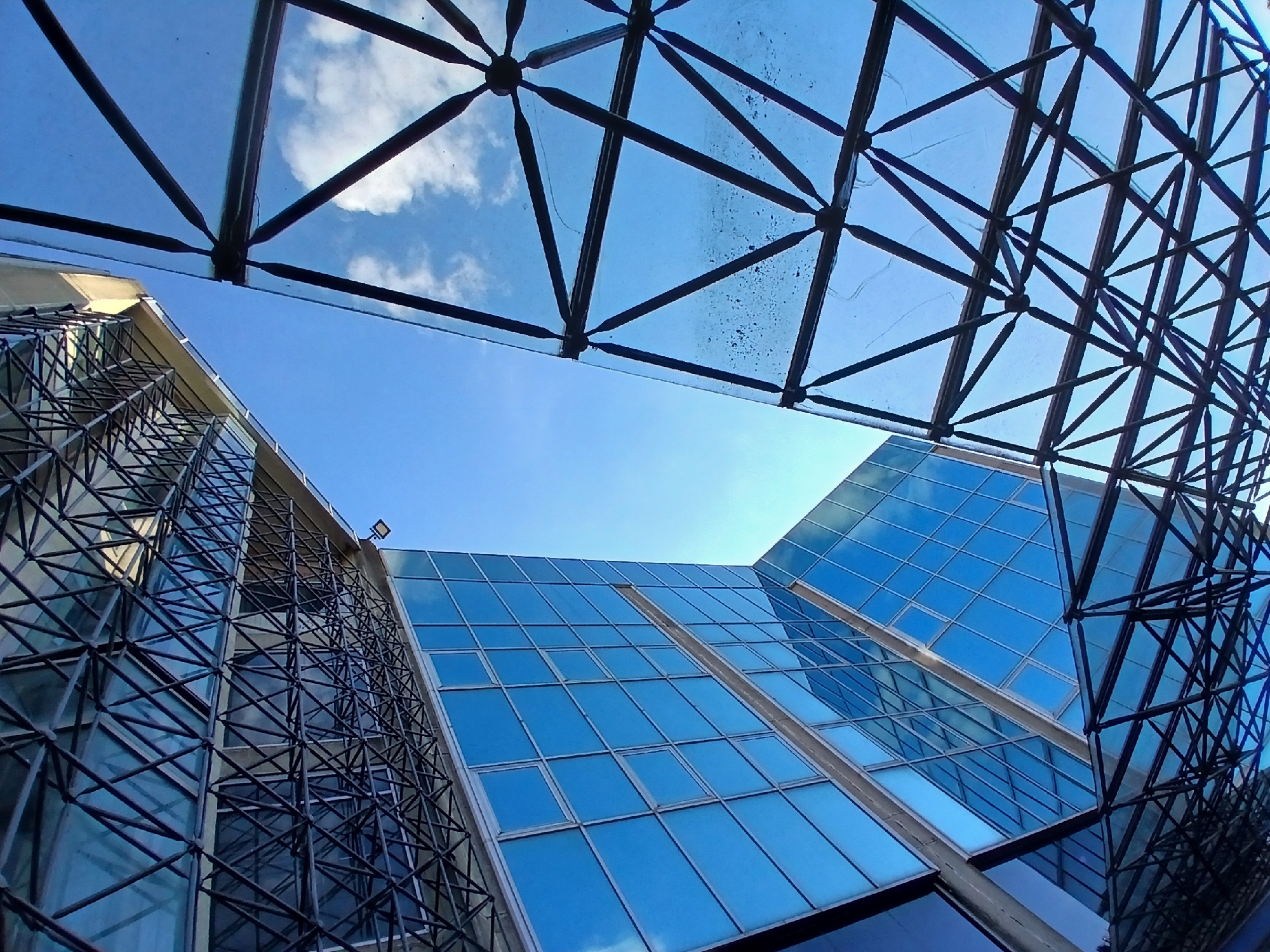 n upward view of modern buildings in Ciudad Guayana, Venezuela. The buildings have glass facades, reflecting the clear blue sky and scattered white clouds. A black metal framework, possibly a canopy or structural element, partially obscures the sky and the buildings. The geometric design of the metal structure contrasts with the rectangular patterns of the glass windows. No people or other animate subjects are visible in the frame. The light suggests it is daytime.