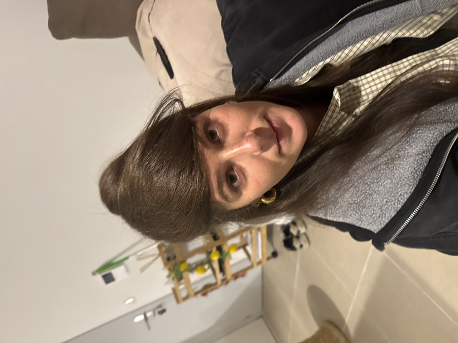 A young woman with shoulder-length brown hair, fair skin, and brown eyes gazes at the camera. She is wearing a black jacket with a gray hood and a light-colored checkered shirt underneath. A gold hoop earring is visible on her left ear. The background includes a beige couch, a wooden shelf with lemons and flowers, and a tan-colored floor. The image has been rotated.