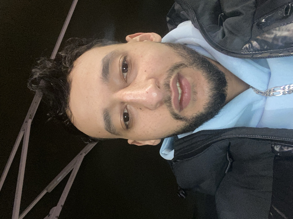 A person with tan skin, dark curly hair, and a beard looks at the camera. He wears a light blue hoodie underneath a black and gray jacket. A silver chain is visible at his neck. In the background, there are geometric structures that are pale in color. The remaining background space is dark, creating a contrasting backdrop. The picture is taken at an angle, so the man is slightly turned.