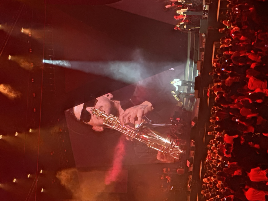 This image depicts a live musical performance occurring within a large indoor arena, identified as Arena Sofia (formerly Arena Armeec) in Sofia, Bulgaria. The scene is illuminated predominantly by red stage lighting, creating a hazy atmosphere with a prominent white spotlight beam directed onto the right side of the stage. On the main stage, a large LED screen displays a close-up image of a male musician wearing a dark hat and sunglasses, playing a golden saxophone. Visible tattoos are present on his left arm/hand in the screen projection. Below the screen, on the stage floor, a male saxophone player matching the appearance on the LED screen is performing center-left. Next to him, a male vocalist in a light-colored shirt stands, gesturing with his right hand. To the left of these central figures, additional musicians with instruments are partially visible. To the right, a group of approximately five female backup singers or performers in dark attire stand in a line. A dense audience, numbering in the hundreds, occupies the floor area directly in front of the stage. Many individuals in the crowd are holding up illuminated smartphones, presumably recording or taking photographs. The audience is largely obscured by the distance and red lighting, rendering individual features indistinct. The overall environment suggests a high-energy concert event.